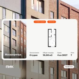 Продаётся квартира-студия площадью 19 кв.м на 7 этаже 17 этажного дома (Корпус 1.2, Секция 3) проекта ПИК Москворечье. Светлый просторный подъезд на уровне земли, функциональная планировка, большие окна, c отделкой.