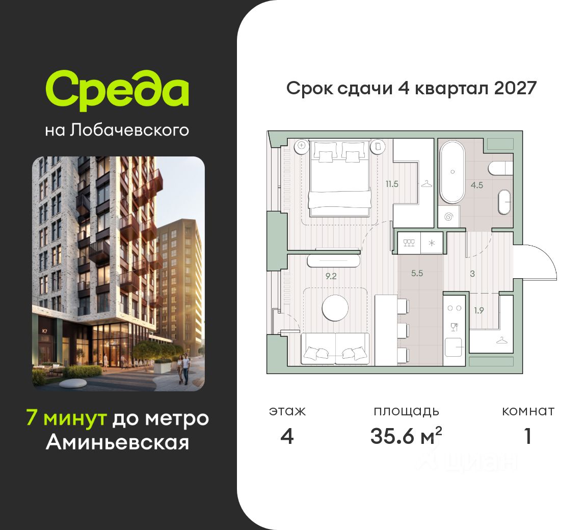 Продаётся 1-комнатная квартира общей площадью 35.6 кв.м. без отделки. Квартира расположена на 4 этаже корпуса 5.5 в жилом комплексе бизнес-класса "Среда на Лобачевского" в пешей доступности от метро "Аминьевская".