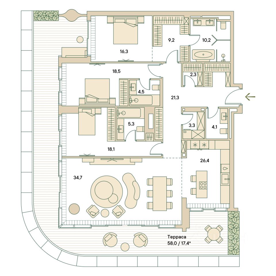Четырёхкомнатная wellness-резиденция площадью 188.5 кв. м. на 3 этаже с видом на Рублёвское шоссе и двор в доме премиум-класса Springs.