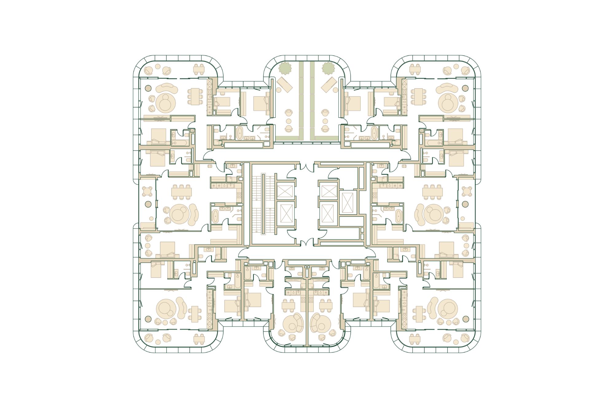 Концепция благоустройства Springs, разработанная студией Wowhaus, воплощает идею взаимного проникновения парка и озеленения внутренней территории: естественная растительность, дополненная акцентами из цветников, плавно вступает во двор. В сочетании с бионической архитектурой дом является органичным продолжением природного ландшафта парка.