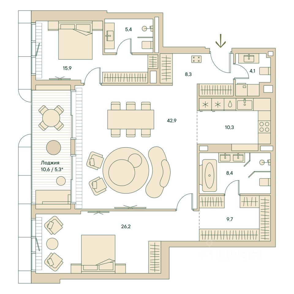 В квартире выполнена чистовая дизайнерская отделка. Резиденция наполнена светом и воздухом, благодаря панорамному остеклению и высоким потолкам.