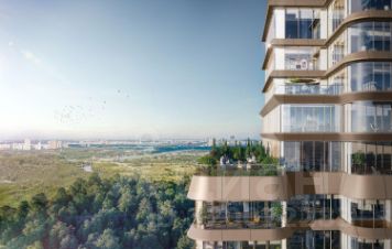 Концепция благоустройства Springs, разработанная студией Wowhaus, воплощает идею взаимного проникновения парка и озеленения внутренней территории: естественная растительность, дополненная акцентами из цветников, плавно вступает во двор. В сочетании с бионической архитектурой дом является органичным продолжением природного ландшафта парка.
