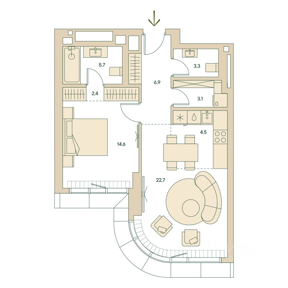 Двухкомнатная wellness-резиденция площадью 62.1 кв. м. на 13 этаже с видом на двор в доме премиум-класса Springs.