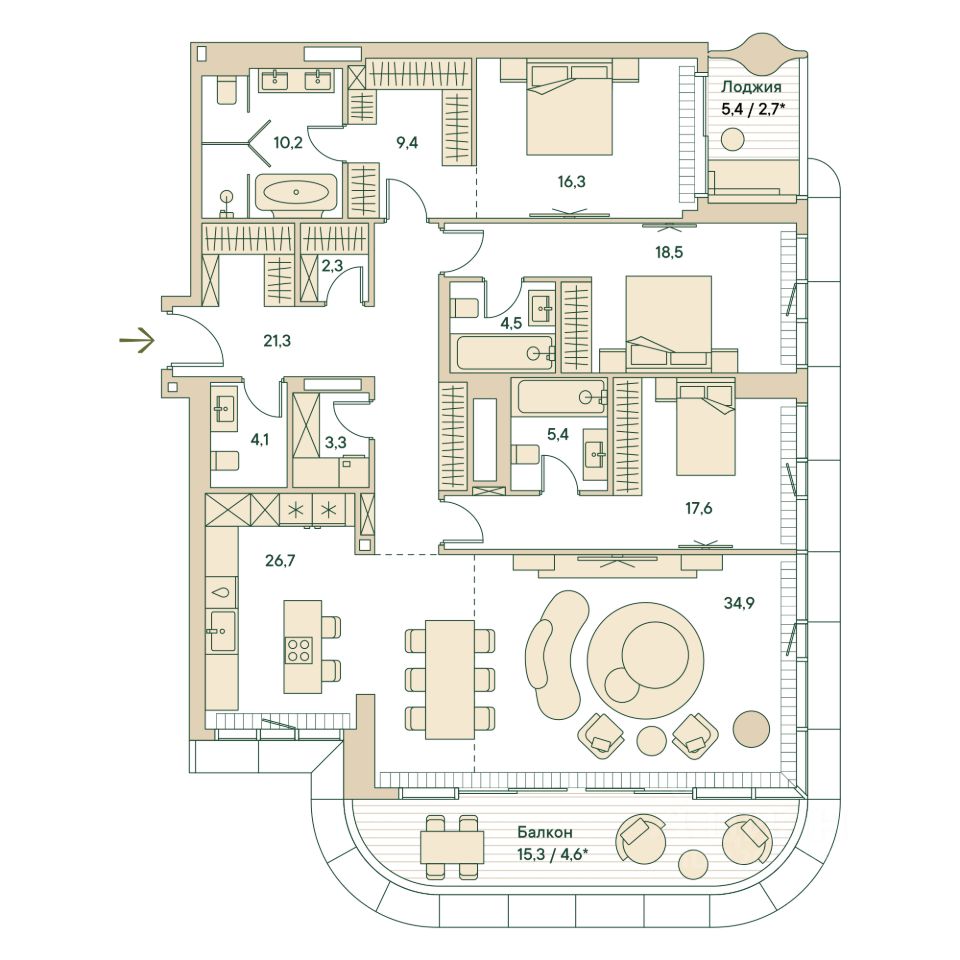 Четырёхкомнатная wellness-резиденция площадью 177.6 кв. м. на 16 этаже с видом на двор и центр в доме премиум-класса Springs.