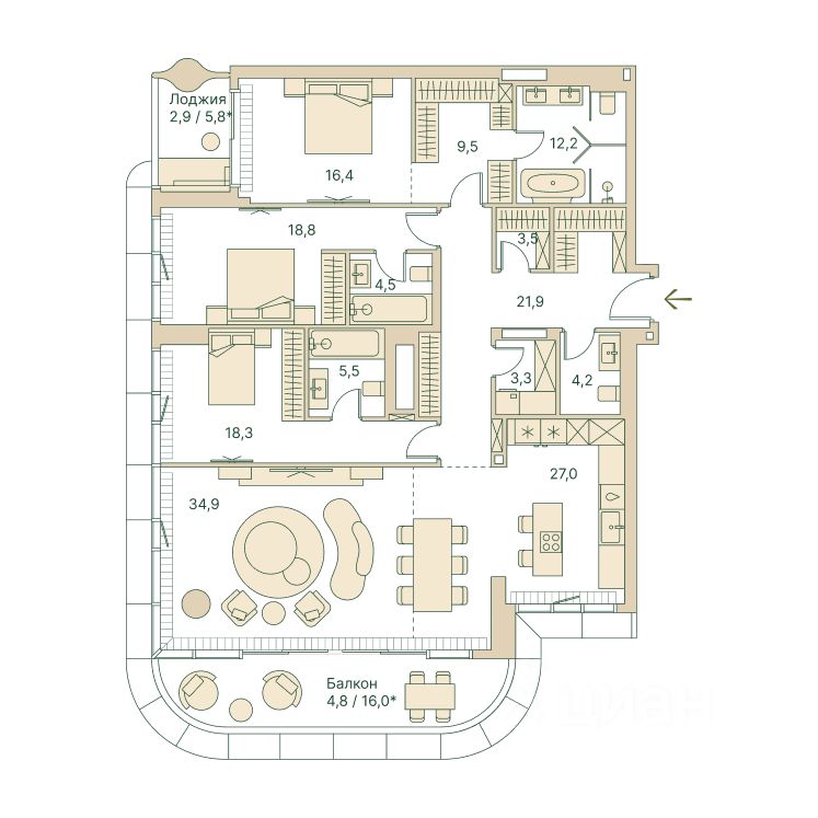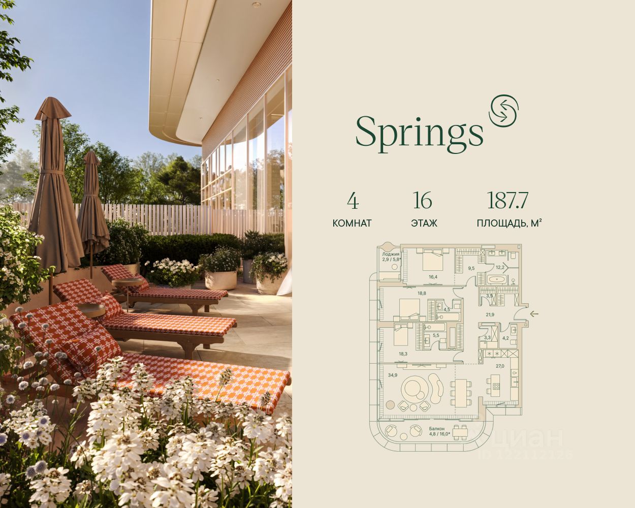 Четырёхкомнатная велнес-резиденция площадью 187.7 кв. м. на 16 этаже с видом на Рублёвское шоссе и двор в доме премиум-класса Springs.