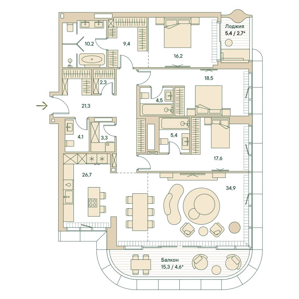 Четырёхкомнатная wellness-резиденция площадью 177.6 кв. м. на 20 этаже с видом на двор и центр в доме премиум-класса Springs.