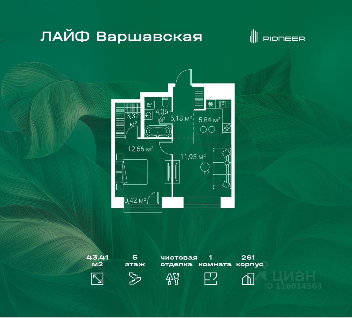 В районе Москворечье-Сабурово продается 1-комнатная квартира площадью 43.41 м². Она расположена на 5 этаже в 261 корпусе нового жилого квартала Лайф Варшавская.