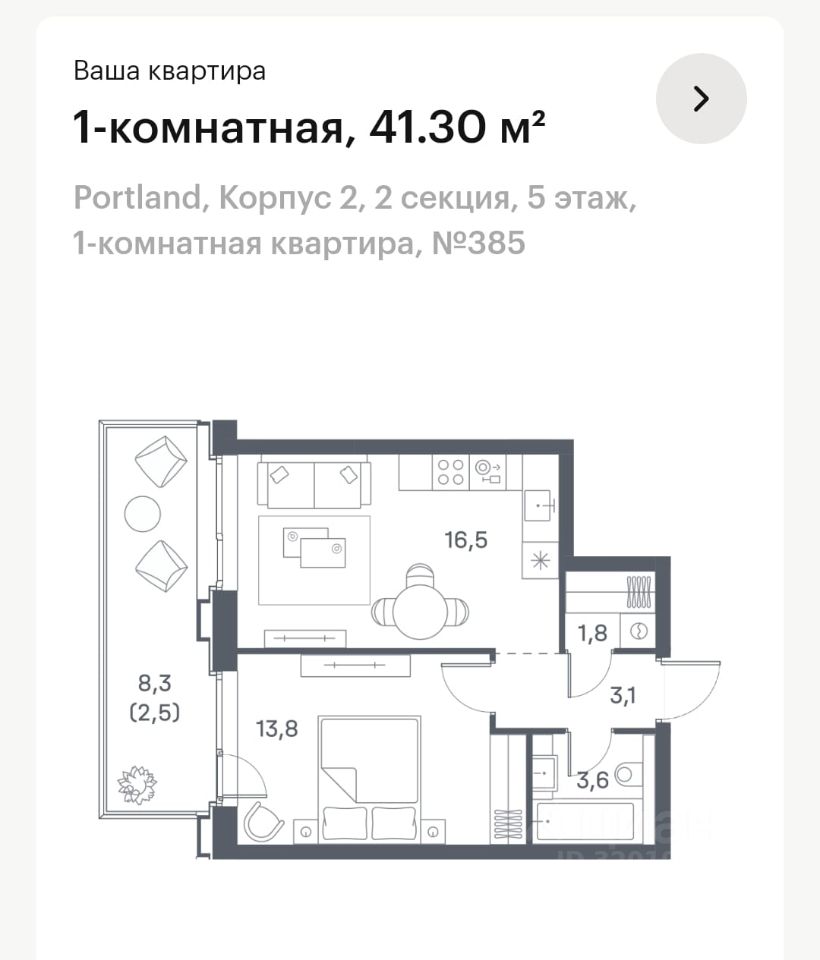 Продается евродвухкомнатная квартира площадью 41,3 кв.м. Корпус 2, секция 2, в ЖК бизнес-класса "Portland". Светлая квартира с панорамными окнами располагается на 5 этаже, вид на Москва-реку.
