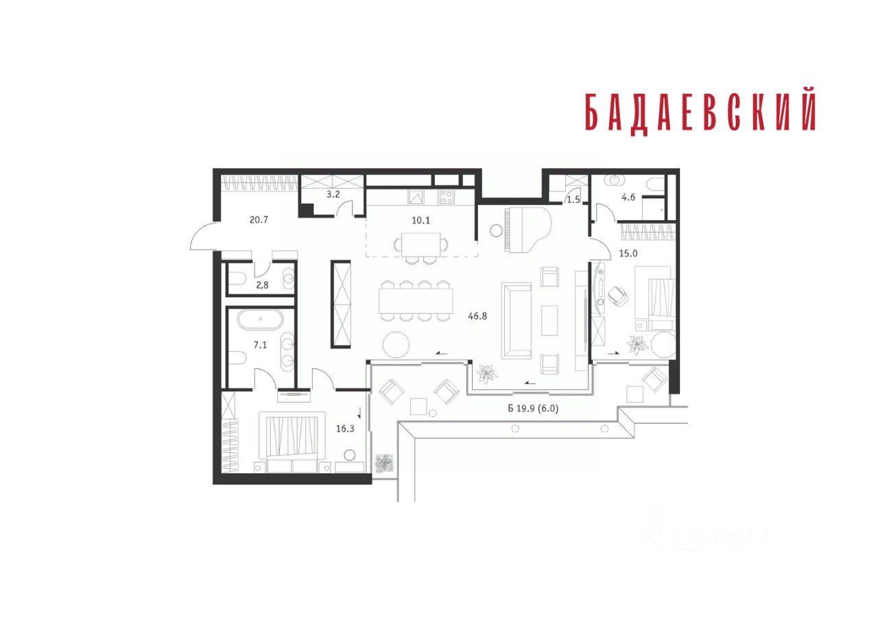 Продаётся 3-комнатная квартира общей площадью 134.10 м² на 10 этаже Жилого Комплекса Бадаевский.