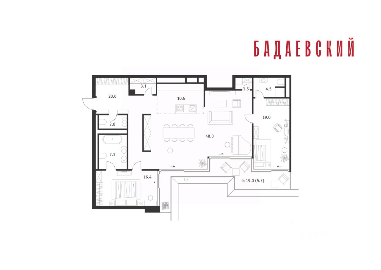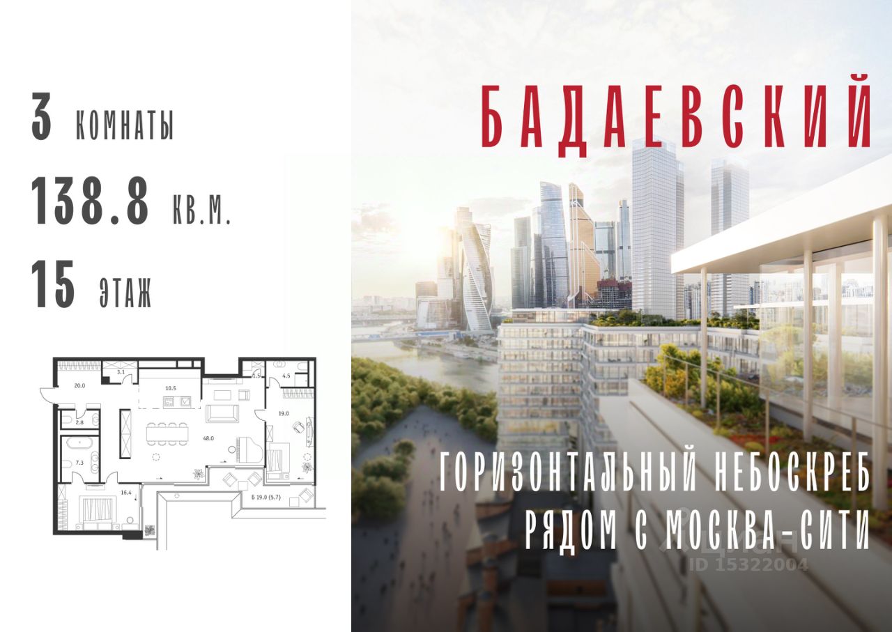 Продаётся 3-комнатная квартира общей площадью 138.80 м² на 15 этаже Жилого Комплекса Бадаевский.