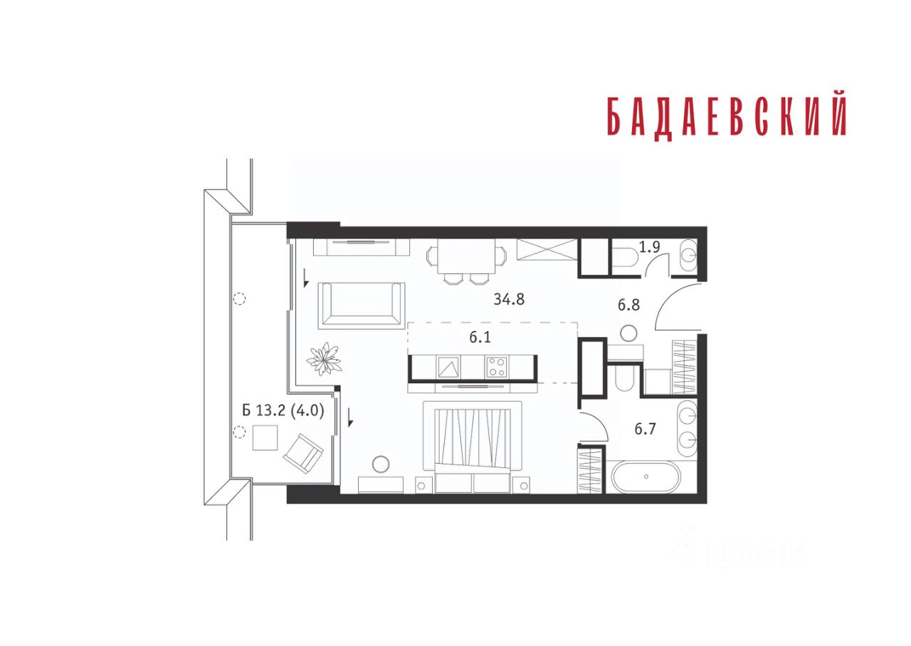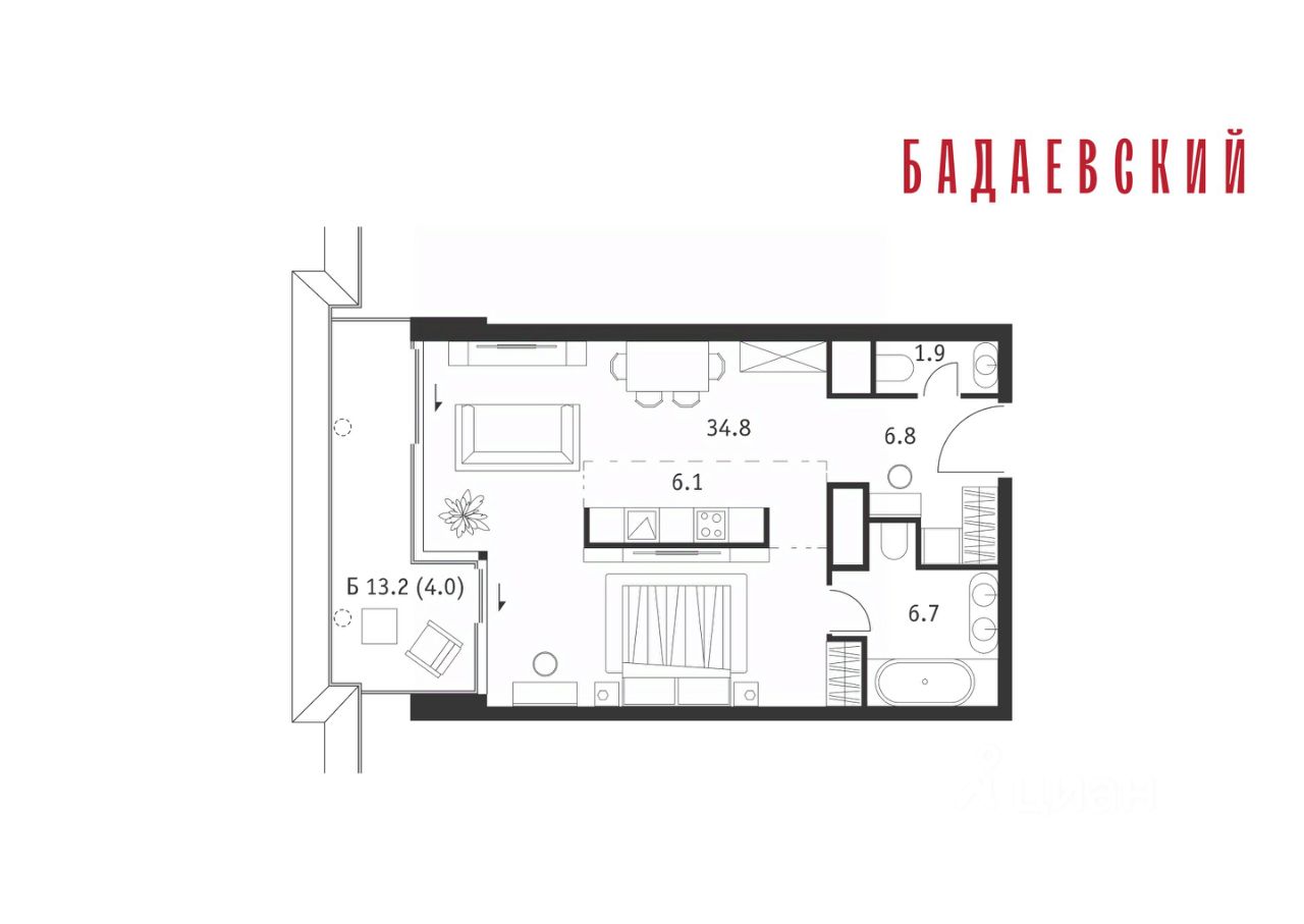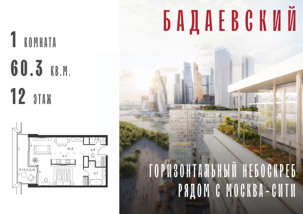 Продаётся 1-комнатная квартира общей площадью 60.30 м² на 12 этаже Жилого Комплекса Бадаевский.