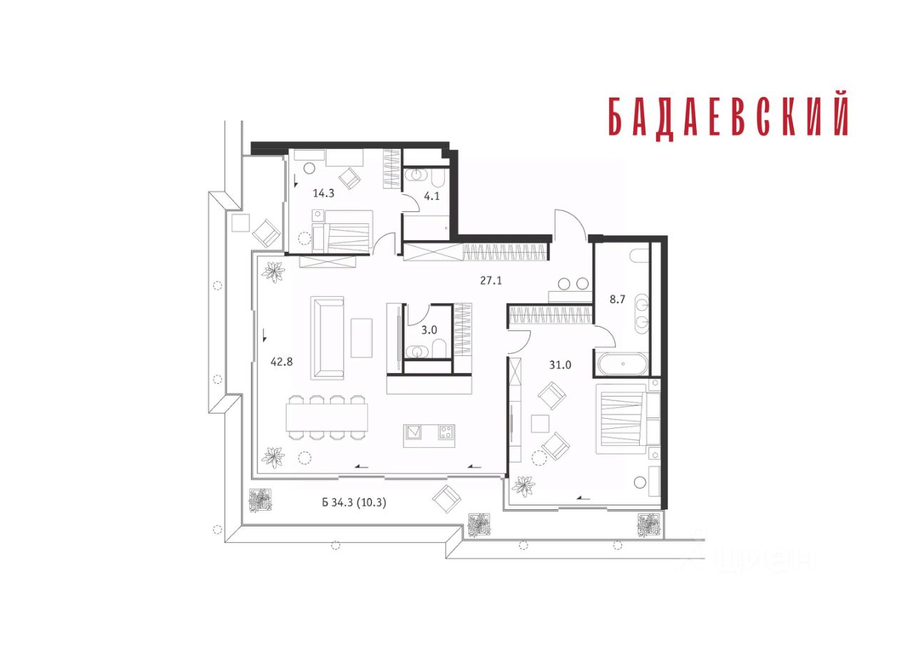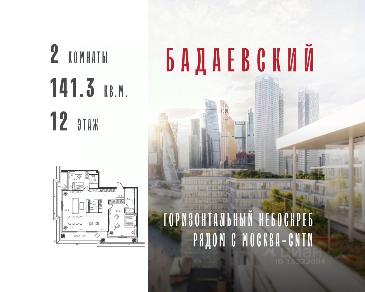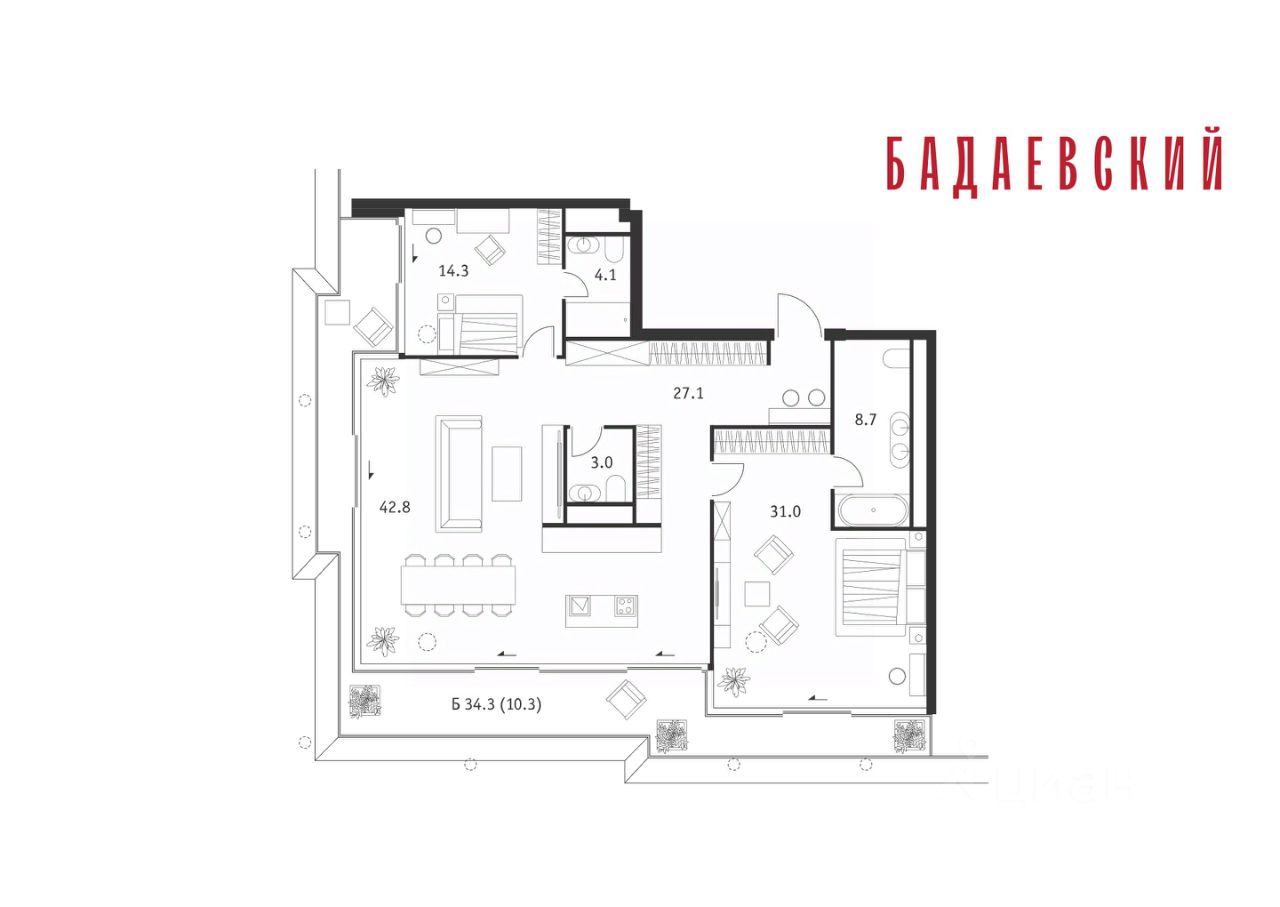 Продаётся 2-комнатная квартира общей площадью 141.30 м² на 12 этаже Жилого Комплекса Бадаевский.