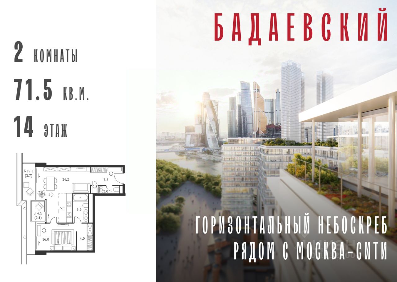 Продаётся 2-комнатная квартира общей площадью 71.50 м² на 14 этаже Жилого Комплекса Бадаевский.