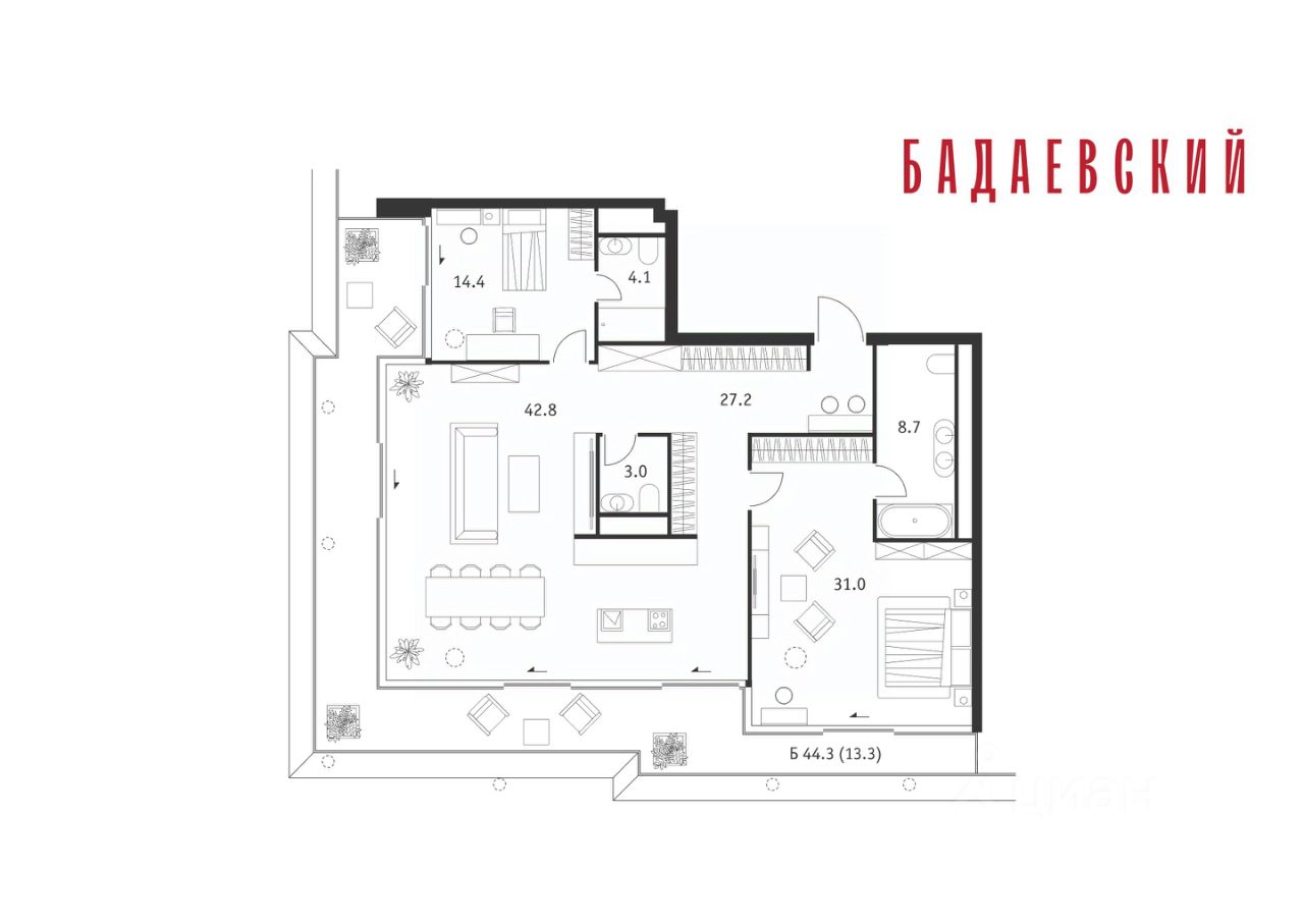 Продаётся 2-комнатная квартира общей площадью 144.50 м² на 14 этаже Жилого Комплекса Бадаевский.