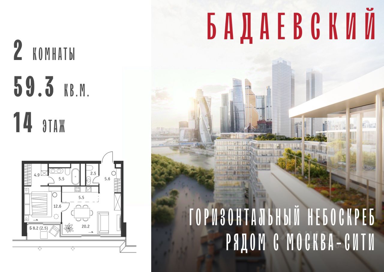Продаётся 2-комнатная квартира общей площадью 59.30 м² на 14 этаже Жилого Комплекса Бадаевский.