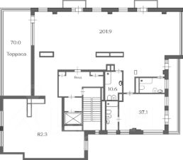 Пентхаус в одном уровне, без отделки. Внутренняя площадь 347,5 кв.м., видовая терраса 69,3 кв.м., дополнительно три небольших балкона.