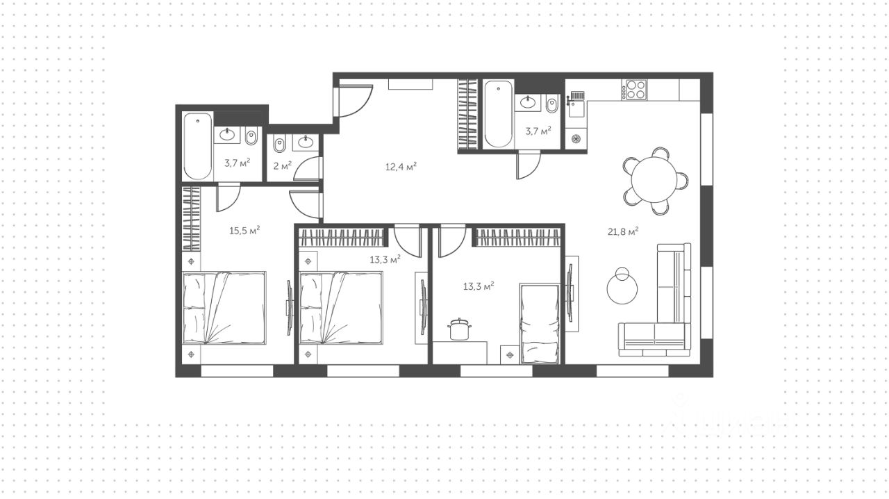 Продается просторная квартира с тремя спальнями общей площадью 92 м² в комплексе бизнес-класса Настоящее. Квартира со свободной планировкой расположена на двадцать четвёртом этаже в корпусе 4, секция 1.