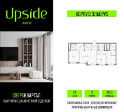 Продаётся 3-комнатная квартира площадью 104.3 кв.м на 54 этаже 55 этажного корпуса Эльбрус в квартале небоскребов "Upside Towers". c видом на 2 очередь, прогулочный бульвар, парк Сокольники, центр, Москва Сити. Номер квартиры А5403.