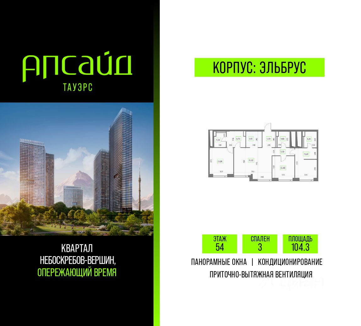 Продаётся 3-комнатная квартира площадью 104.3 кв.м на 54 этаже 55 этажного корпуса Эльбрус в квартале небоскребов "Апсайд Тауэрс". С видом на 2 очередь, прогулочный бульвар, парк Сокольники, центр, Москва Сити. Номер квартиры А5403.