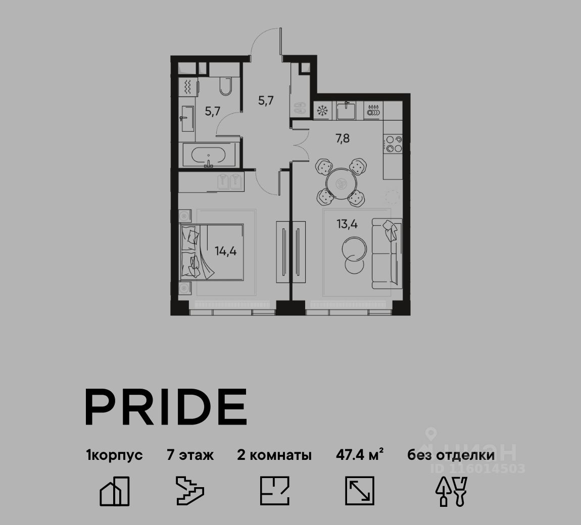 В премиальном жилом квартале PRIDE продается 2-комнатная квартира в 1 корпусе, на 7 этаже, в секции 1. Её общая площадь составляет 47.4 м². Пространство включает 1 уютную спальню 14,4 м², просторную кухню-гостиную 21,2 м² и ванную комнату 5,7 м². Ключи в 2026 году.