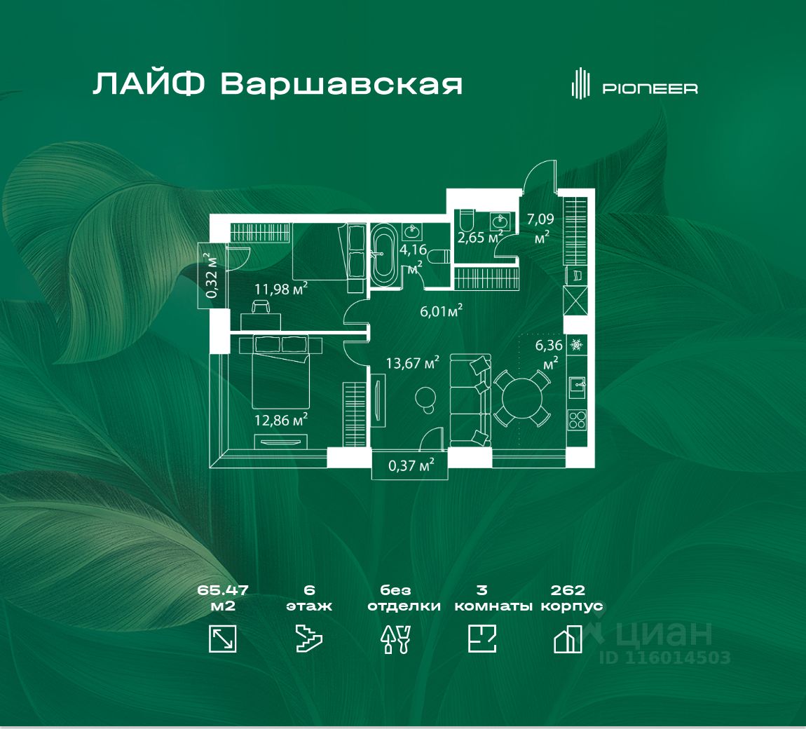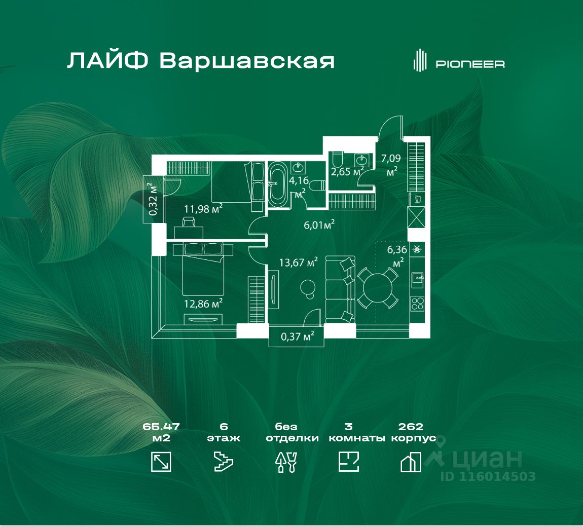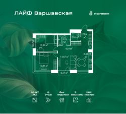 В районе Москворечье-Сабурово продается 3-комнатная квартира площадью 65.47 м². Она расположена на 6 этаже в 262 корпусе нового жилого квартала Лайф Варшавская.