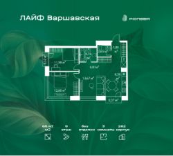В районе Москворечье-Сабурово продается 3-комнатная квартира площадью 65.47 м². Она расположена на 9 этаже в 262 корпусе нового жилого квартала Лайф Варшавская.