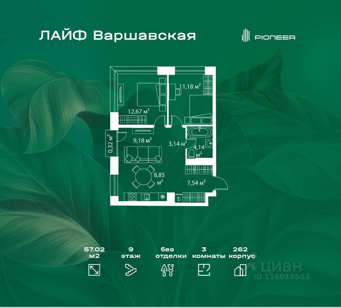 В районе Москворечье-Сабурово продается 3-комнатная квартира площадью 57.02 м². Она расположена на 9 этаже в 262 корпусе нового жилого квартала LIFE Варшавская.