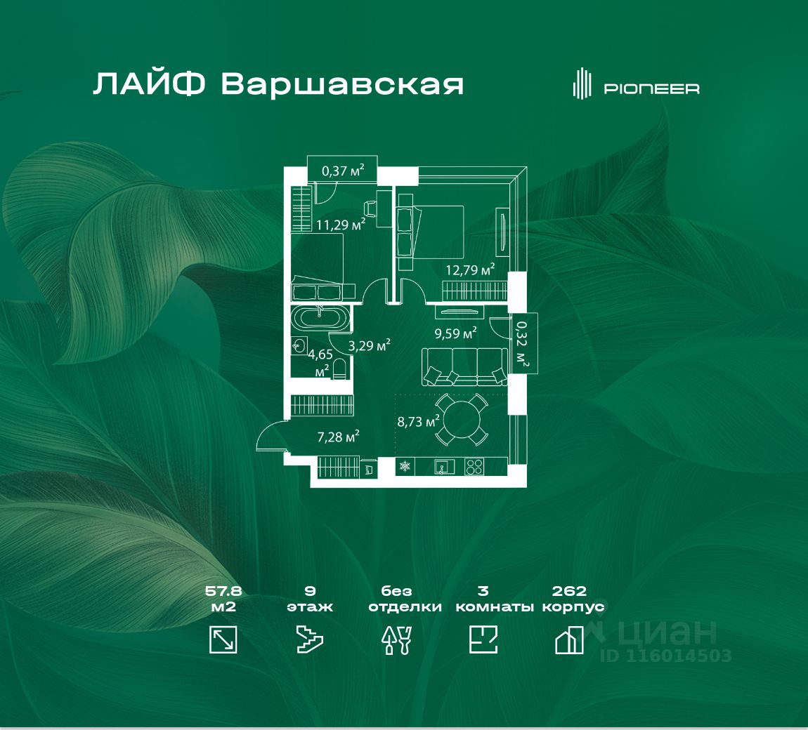 В районе Москворечье-Сабурово продается 3-комнатная квартира площадью 57.8 м². Она расположена на 9 этаже в 262 корпусе нового жилого квартала Лайф Варшавская.