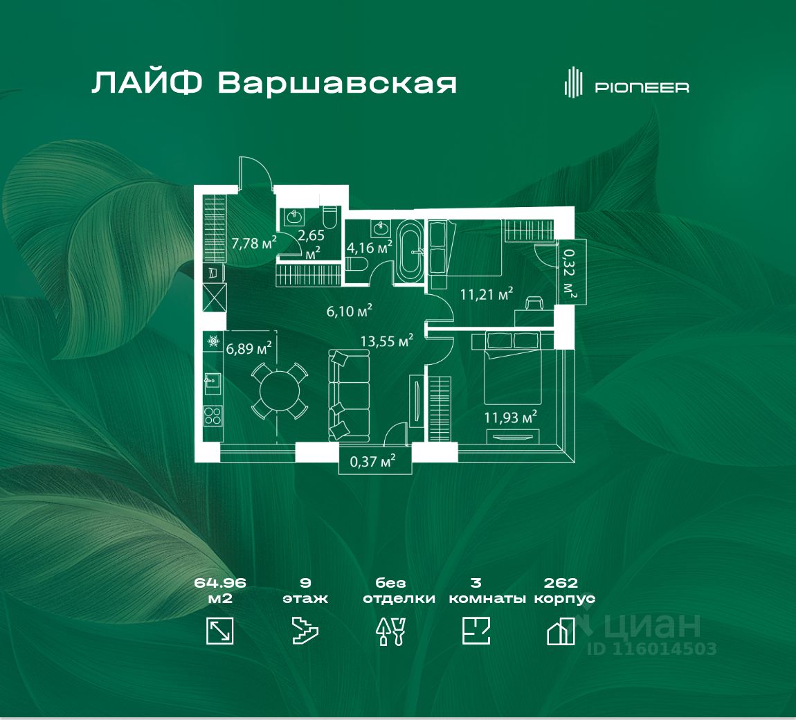 В районе Москворечье-Сабурово продается 3-комнатная квартира площадью 64.96 м². Она расположена на 9 этаже в 262 корпусе нового жилого квартала Лайф Варшавская.