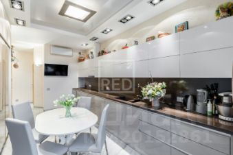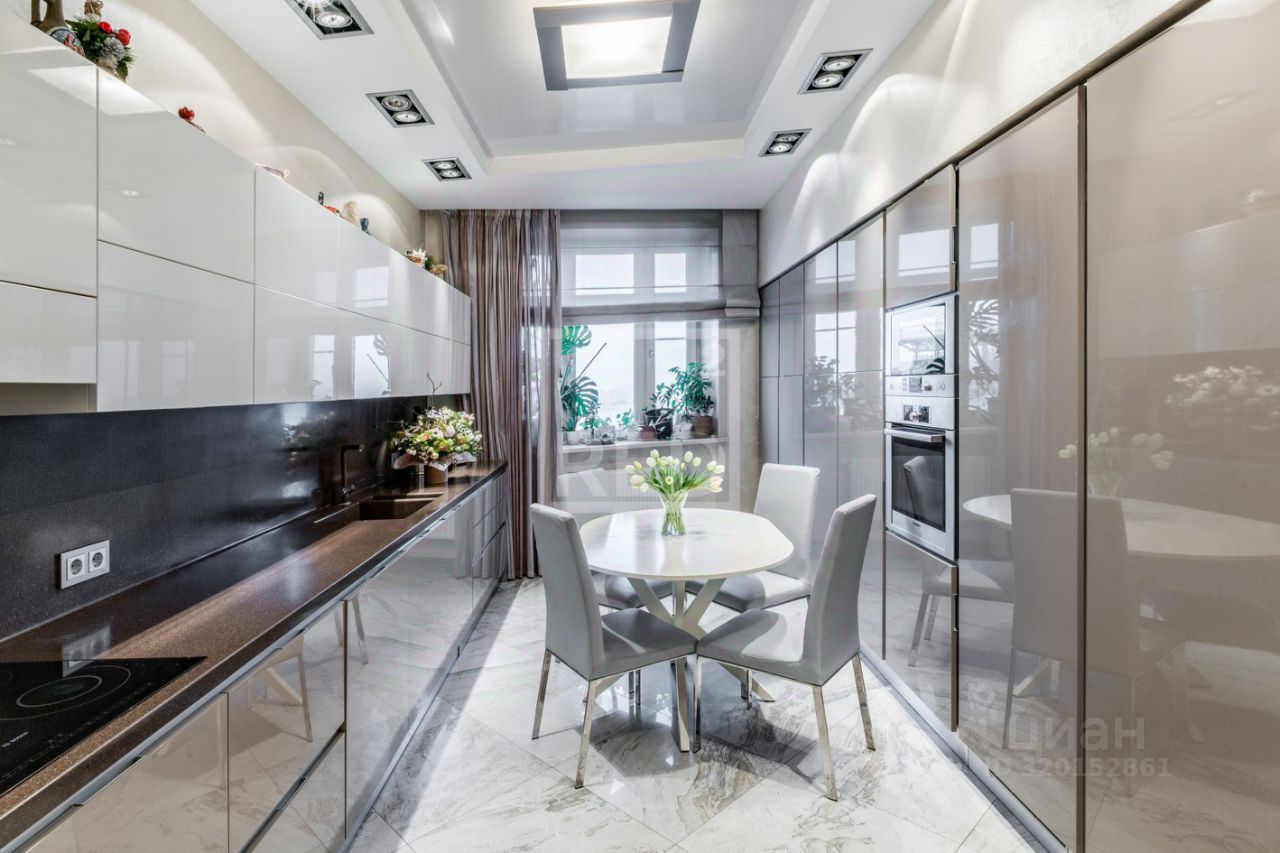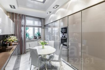 Кухня укомплектована техникой Bosch, в каждой из комнат установлена мебель, выполненная по индивидуальному проекту, предусмотрено много мест для хранения вещей.