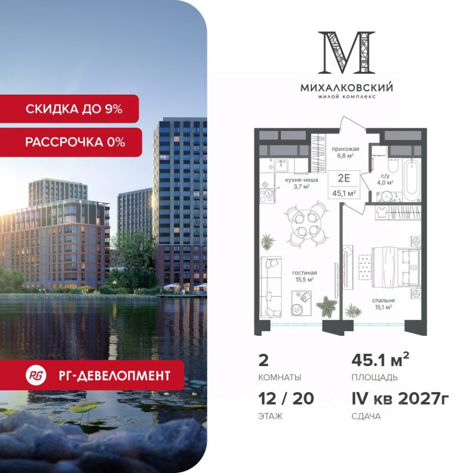 Продаётся 2-к квартира 45,1 кв.м. в ЖК "Михалковский" на 12-м этаже 20 этажного дома.