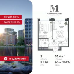 Продаётся 2-к квартира 35,4 кв.м. в ЖК "Михалковский" на 9-м этаже 20 этажного дома.