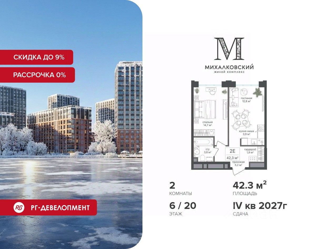 Продаётся 2-к квартира 42,3 кв.м. в ЖК "Михалковский" на 6-м этаже 20 этажного дома.