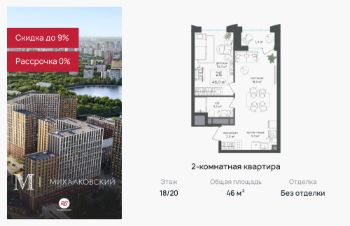 Продаётся 2-к квартира 46,0 кв.м. в ЖК "Михалковский" на 18-м этаже 20 этажного дома.