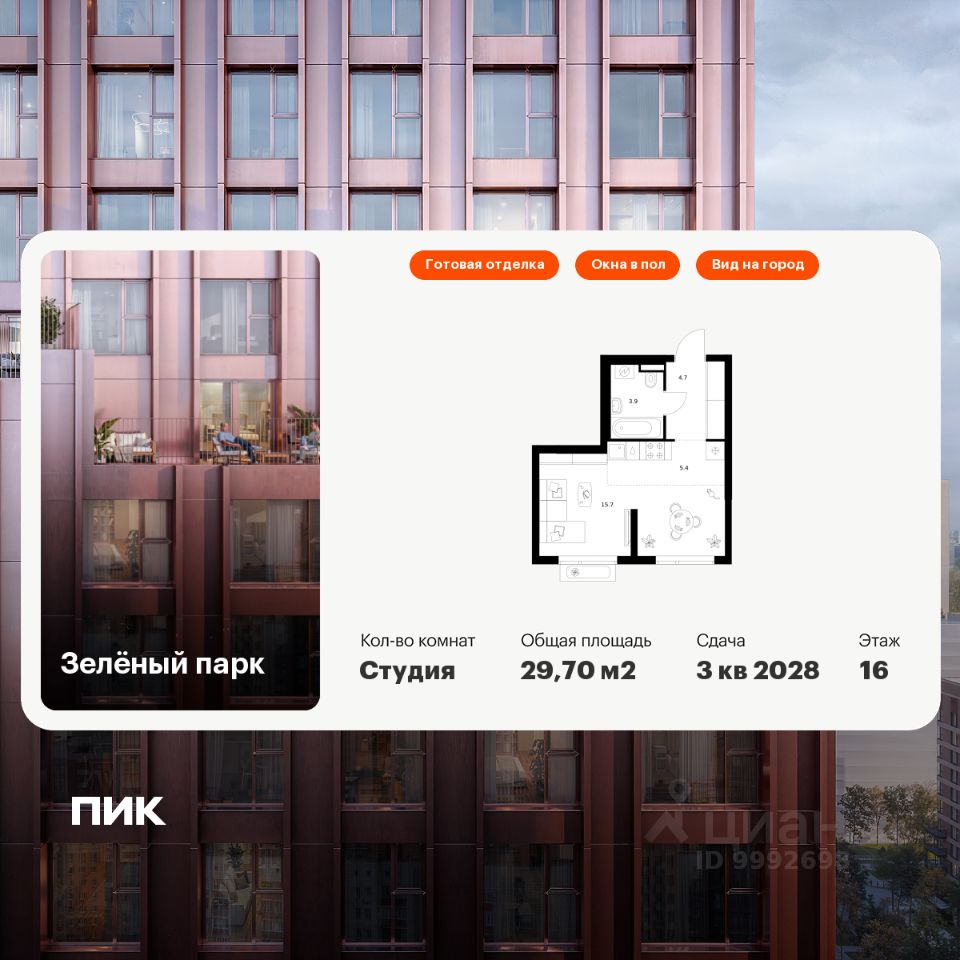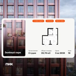 Продаётся квартира-студия площадью 29,7 кв.м на 16 этаже 21 этажного дома (Корпус 5.2, Секция 1) проекта ПИК Зелёный парк. Светлый просторный подъезд на уровне земли, функциональная планировка, большие окна, c отделкой.