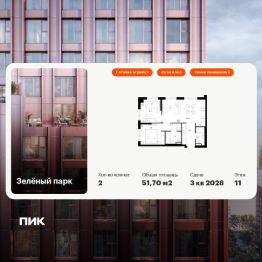Продаётся 2-комн. квартира площадью 51,7 кв.м на 11 этаже 13 этажного дома (Корпус 5.3, Секция 4) проекта ПИК Зелёный парк. Светлый просторный подъезд на уровне земли, функциональная планировка, большие окна, c отделкой.