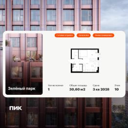 Продаётся 1-комн. квартира площадью 30,6 кв.м на 10 этаже 13 этажного дома (Корпус 5.3, Секция 3) проекта ПИК Зелёный парк. Светлый просторный подъезд на уровне земли, функциональная планировка, большие окна, c отделкой.