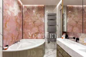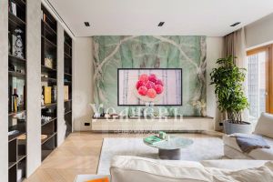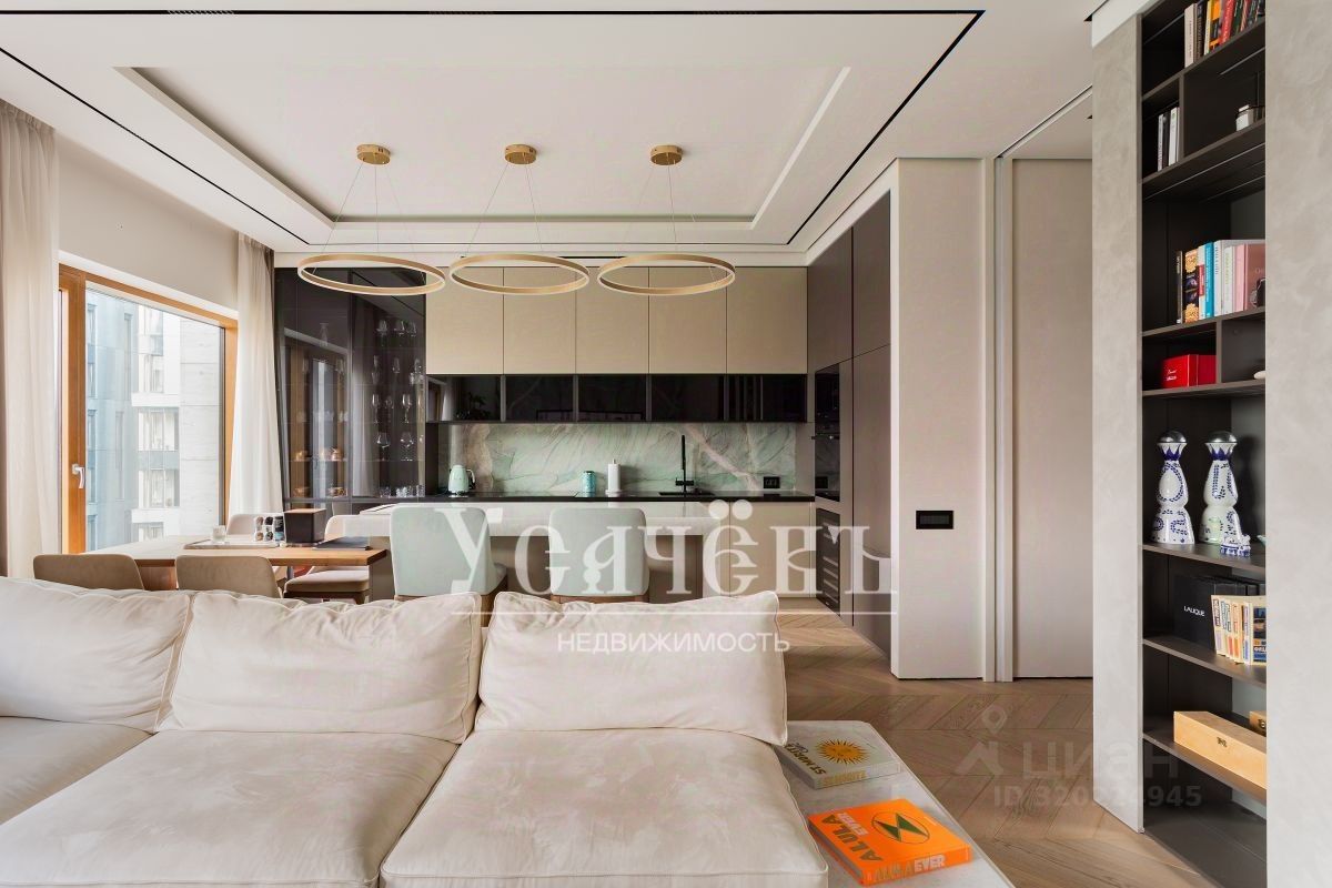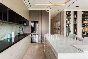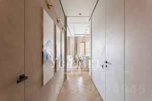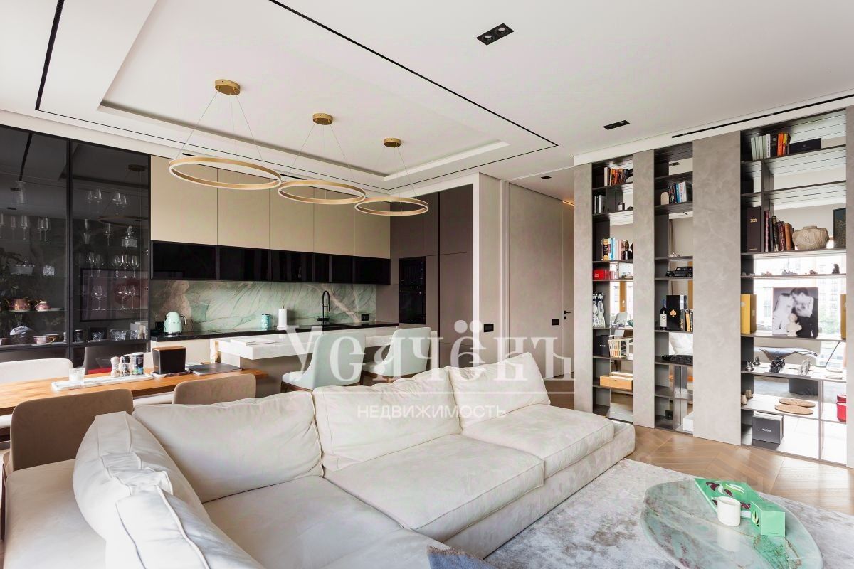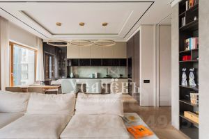 В квартире восемь окон, обеспечивающих естественное освещение и вид на двор и пруд. Шумоизоляция создаёт спокойную атмосферу, а отделка из экологически чистых материалов, таких как мрамор и дуб, гарантирует комфорт.