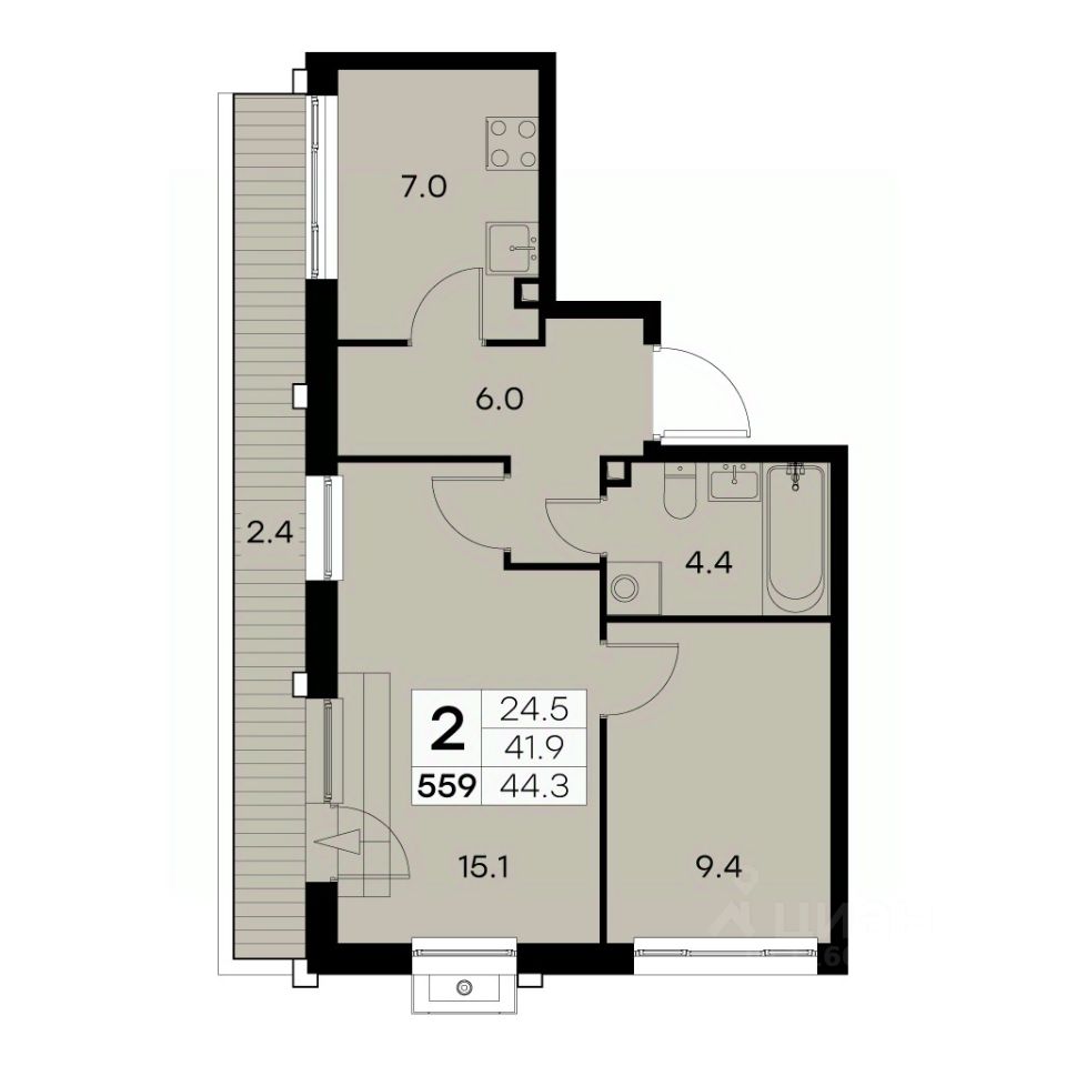 Общая площадь44,3 м²