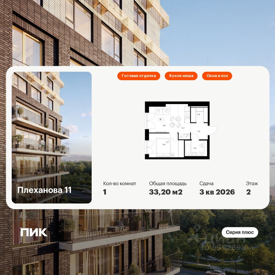 Продаётся 1-комн. квартира площадью 33,2 кв.м на 2 этаже 31 этажного дома (Корпус 1.3, Секция 3) проекта ПИК Плеханова 11. Светлый просторный подъезд на уровне земли, функциональная планировка, большие окна, c отделкой.