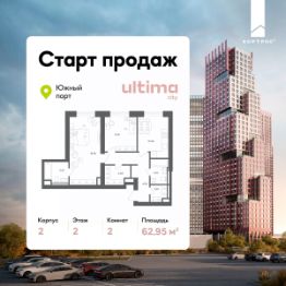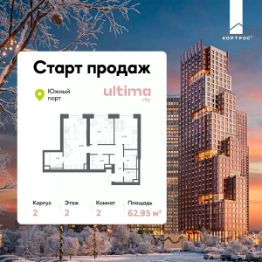 Старт продаж! Продаётся 2-комнатная квартира от застройщика ГК "КОРТРОС" в жилом комплексе бизнес-класса ULTIMAcity. Квартира расположена на 2 этаже 52 этажного корпуса 2. Общая площадь 62,95 м². Без отделки.