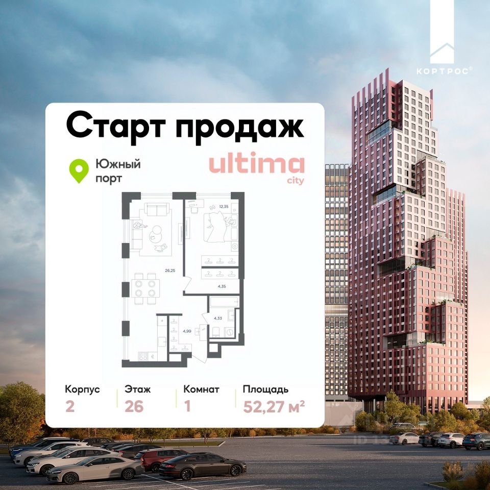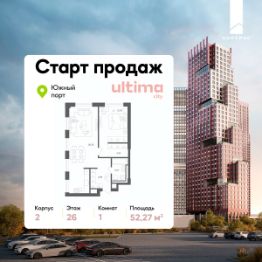 Старт продаж! Продаётся 1-комнатная квартира от застройщика ГК "КОРТРОС" в жилом комплексе бизнес-класса ULTIMAcity. Квартира расположена на 26 этаже 52 этажного корпуса 2. Общая площадь 52,27 м². Без отделки.