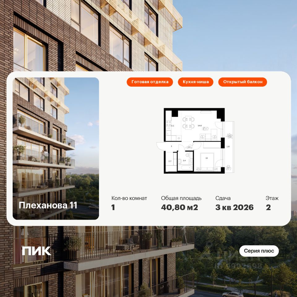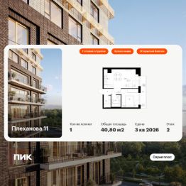 Продаётся 1-комн. квартира площадью 40,8 кв.м на 2 этаже 31 этажного дома (Корпус 1.3, Секция 3) проекта ПИК Плеханова 11. Светлый просторный подъезд на уровне земли, функциональная планировка, большие окна, c отделкой.