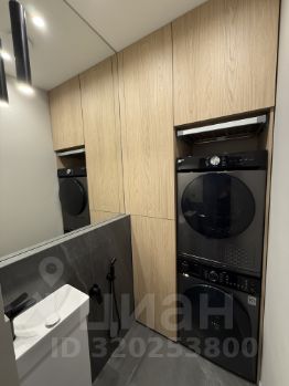 Отдельная постирочная со стиральной машиной, сушильной машиной и большим шкафом для хранения.