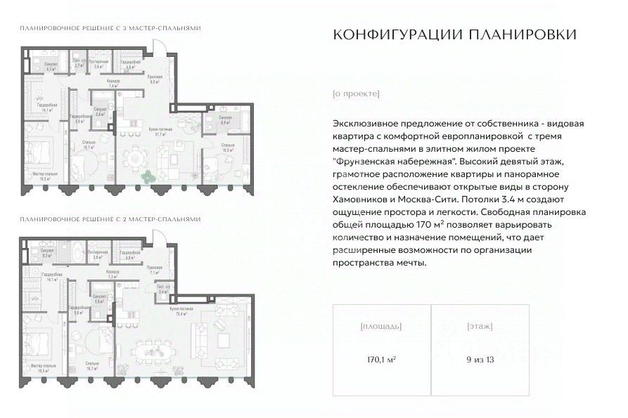 Арт. 111857883 ID: N34 Эксклюзивное предложение от собственника по цене ниже застройщика - видовая квартира с комфортной европланировкой с тремя мастер-спальнями в элитном жилом проекте "Фрунзенская набережная". Высокий девятый этаж, грамотное расположение квартиры и панорамное остекление обеспечивают открытые виды в сторону Хамовников и Москва-Сити. Потолки 3.4 м создают ощущение простора и легкости. Свободная планировка общей площадью 170 м позволяет варьировать количество и назначение помещений, что дает расширенные возможности по организации пространства мечты.