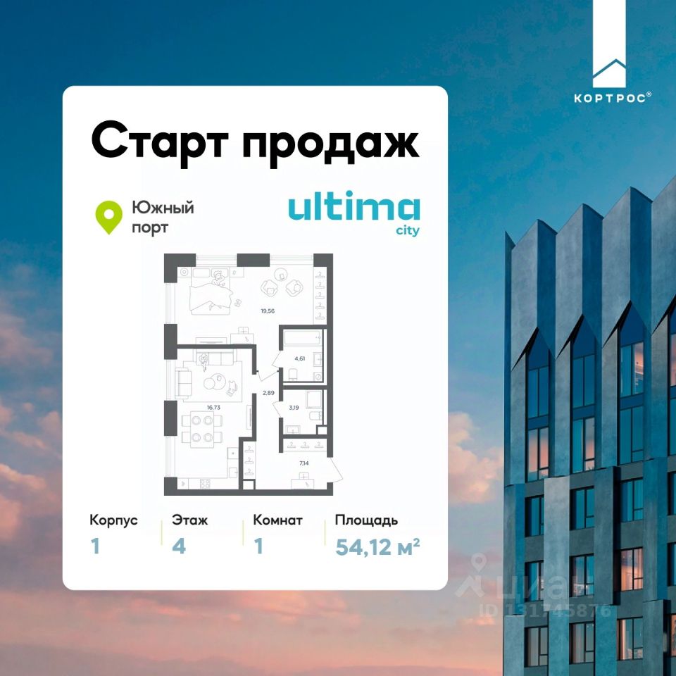 Старт продаж! Продаётся 1-комнатная квартира от застройщика ГК "КОРТРОС" в жилом комплексе бизнес-класса ULTIMAcity. Квартира расположена на 4 этаже 45 этажного корпуса 1. Общая площадь 54,12 м². Без отделки.