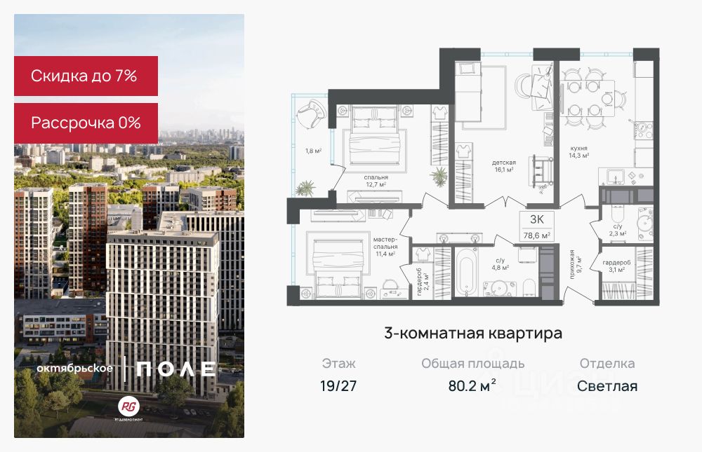Продаётся 3-к квартира 80,2 кв.м. в ЖК "Октябрьское поле" на 19-м этаже 27 этажного дома.