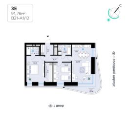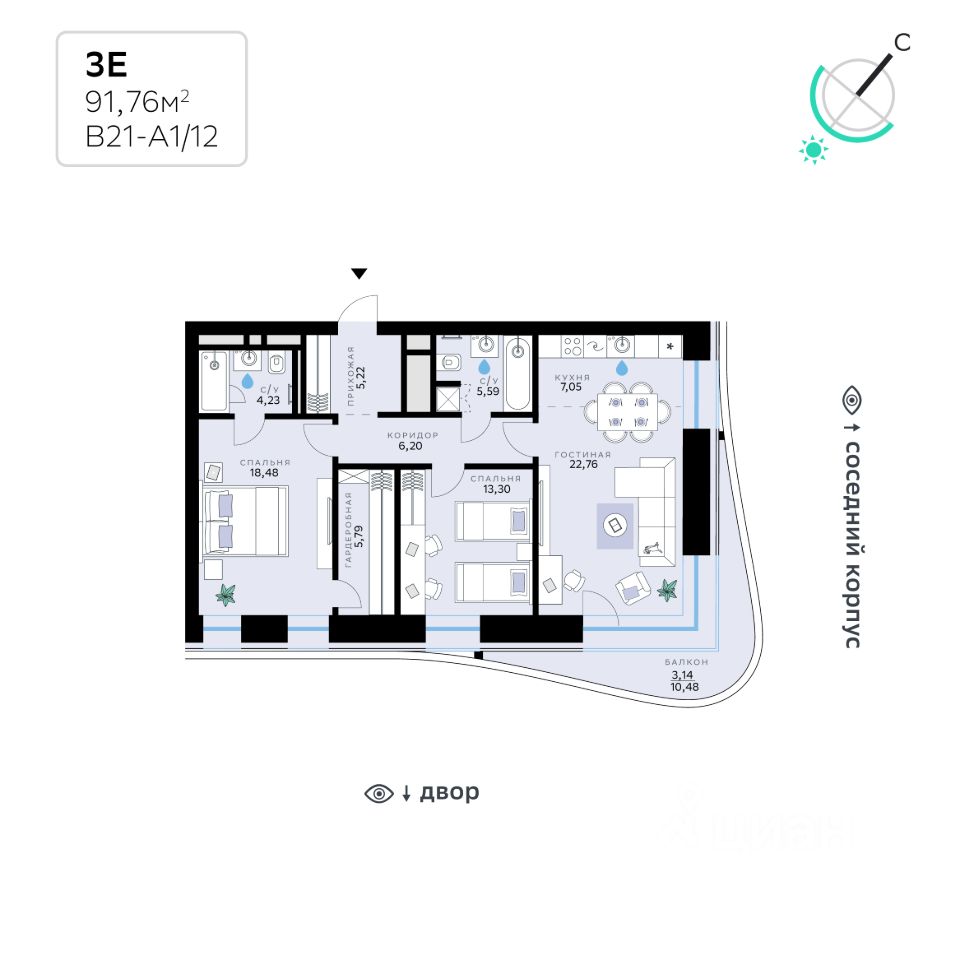 В продаже — двухкомнатная квартира с чистовой отделкой, общей площадью 91,76 кв. м. Квартира расположена на четвертом этаже одинадцатиэтажной секции корпуса класса Адвансд в новом районе СберСити, который строит Сбер. Дом находится на второй береговой линии Москвы-реки.