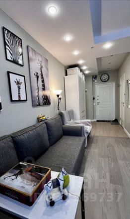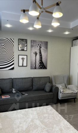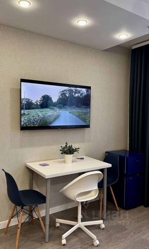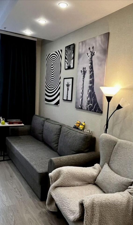 Большой шкаф для хранения вещей, диван Askona, стильное кресло для отдыха, телевизор.