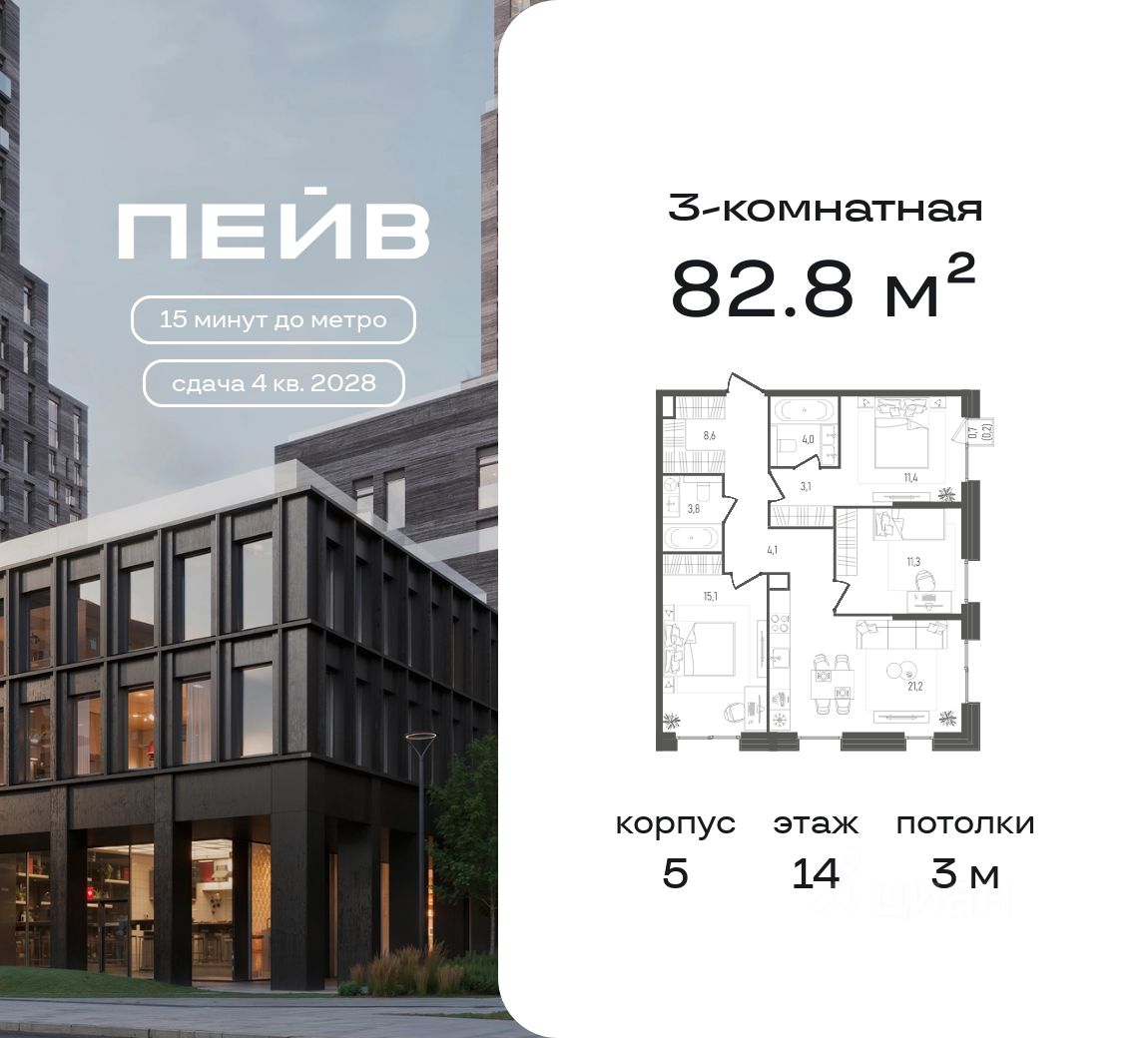 Продается трехкомнатная квартира 477 общей площадью 82.8 кв. м на 14-м этаже 21-этажного дома, корпус 5. Предчистовая отделка.